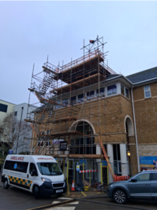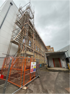 A high‑level gutter inspection and clearance is currently underway, supported by specialist scaffolding that will remain in place for several months. This proactive work is essential to prevent blockages, reduce the risk of water ingress and protect the hospital’s building fabric. The scaffolding also enables safe access for general maintenance activities, helping to reduce long-term roof damage and avoid future unplanned repair costs.